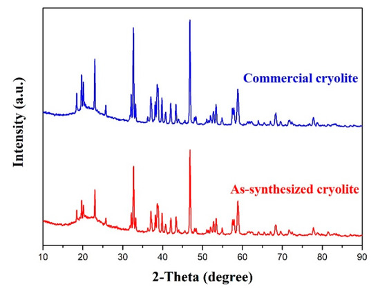 The XRD patterns of commercial cryolite and as-synthesized cryolite.