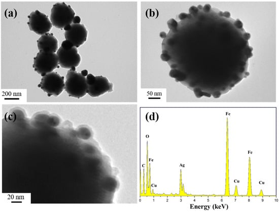 TEM images (a–c) and EDS spectra (d) of the Fe3O4@PDA/Ag/PDA nanospheres.