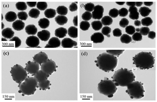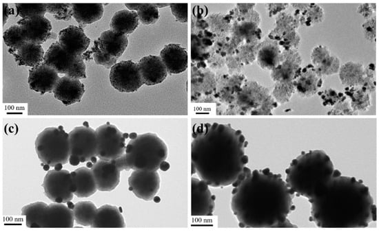 TEM images of the Fe3O4 (a), Fe3O4@PDA (b), Fe3O4@PDA/Ag (c), and Fe3O4@PDA/Ag/PDA (d) nanospheres.
