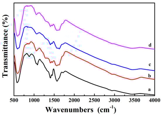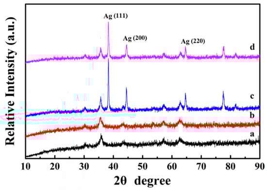 Figure 5a is the FTIR spectrum of the Fe3O4 core, where the broad peaks at 1413 cm−1 and 1622 cm−1 are corresponded to the vibrational absorption of the COO– and O–H bonds of the PAA, which is used as the surfactant during the synthesis of Fe3O4 nanosphere. Here, the peak observed at 3440 cm−1 is originated from the stretching vibration of O–H. After coating a PDA shell on Fe3O4, the strong vibration absorption band (Fe–O vibration absorption) at 595 cm−1 gradually weakened. The PDA shell is very thin and the absorption band of the PDA is weak, so the curve of Fe3O4@PDA has no additional key absorption peaks (Figure 5b). When Ag nanoparticles are fixed to the surface of the PDA shell, the vibration absorption of the Fe–O bond at 595 cm−1 is further reduced (Figure 5c). Finally, the broad absorption between 1000 and 1700 cm−1 demonstrates the presence of PAA and PDA polymers in the Fe3O4@PDA/Ag/PDA nanospheres (Figure 5d).