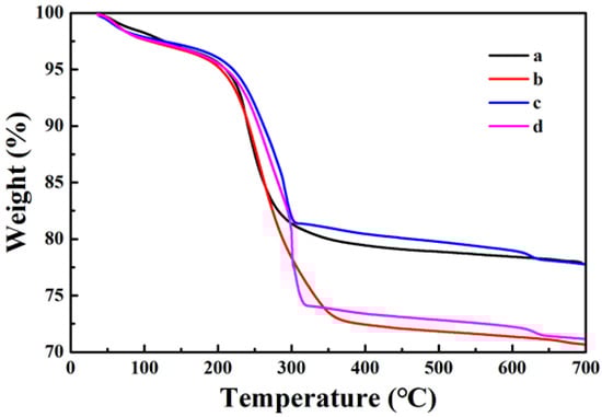 The synthesis process of the sample was also tracked by testing the TG curve in an air atmosphere in the temperature range of 25~700 °C. As shown in Figure 4, the weight loss rates of each sample are 22.3%, 29.4%, 22.2%, and 28.9%. Observing the original TG curve of Fe3O4, it can be seen that its weight has decreased, because the organic groups and moisture remaining in the core of Fe3O4 disappear with increasing temperature (Figure 6a). When the surface of the Fe3O4 core is coated with the PDA shell, the weight loss rate increases by about 7.1% in comparison to Fe3O4. This is because the PDA shell will decompose and disappear in the high temperature (Figure 6b). In comparison to Fe3O4@PDA, the weight loss rate of Fe3O4@PDA/Ag reduces by 7.2% (Figure 6c) because of the presence of Ag nanoparticles. At last, the weight loss rate of Fe3O4@PDA/Ag/PDA is further increased than that of Fe3O4@PDA/Ag (Figure 6d) because of the second PDA shell.