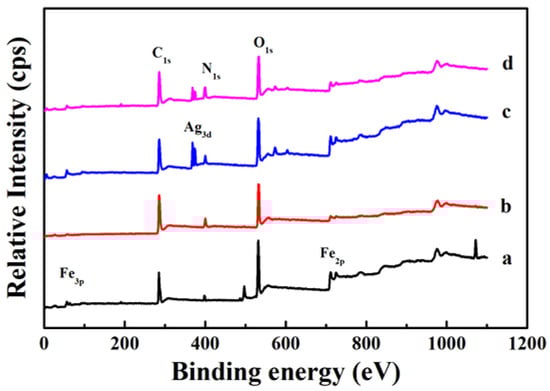 In order to further study the internal structure of the core-shell nanocomposites, XPS is used to analyze the surface element composition of the samples [31]. The XPS spectrum of the Fe3O4 core is shown in Figure 7a and the strong signal peaks of Fe, C, and O elements can be clearly observed. Compared with Fe3O4, there is obviously an N element signal peak in the XPS spectrum of Fe3O4@PDA (Figure 7b), which must be due to the presence of the N element-containing PDA shell. At the same time, it can be seen that the Fe element signal peak sharply reduced, indicating that the PDA the shell layer is evenly coated on the surface of Fe3O4. Because of the thickness of the shell layer is thin, some Fe element signal can be detected. Once the Ag nanocrystals are immobilized on the surface of Fe3O4@PDA, a clear Ag signal peak can be observed (Figure 7c). When another layer of PDA shell was formed on the surface of Fe3O4@PDA/Ag, the relative intensity of the Ag signal peak also decreased significantly (Figure 7d). These results indicate that the magnetic Fe3O4@PDA/Ag/PDA core-shell nanocomposite has been successfully prepared.