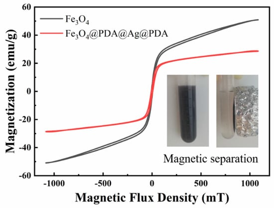 The Fe3O4@PDA/Ag/PDA nanosphere shows a typical magnetic characteristic and the hysteresis loops of Fe3O4 and Fe3O4@PDA/Ag/PDA nanospheres were measured by VSM at room temperature (Figure 8) Since the cluster-like Fe3O4 core is composed of a large number of small secondary nanoparticles, the Fe3O4@PDA/Ag/PDA exhibits typical soft magnetic behavior. Because of the existence of the double polydopamine shell and the discontinuous Ag nanoparticle interlayer, the saturation magnetization of Fe3O4@PDA/Ag/PDA nanospheres (30.3 emu/g) is smaller than original Fe3O4 (47.1 emu/g). However, the magnetic sensitivity of Fe3O4@PDA/Ag/PDA nanospheres is large enough to be easily separated from the reaction system by magnetic separation.