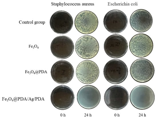 Because Ag nanocrystals have a strong inhibitory effect on a variety of bacteria and show low toxicity to the human body, they are widely used in antibacterial drugs [32]. In this paper, the antibacterial properties of Fe3O4@PDA/Ag/PDA core shell nanospheres were studied using Escherichia coli and Staphylococcus aureus as bacterial models [33,34]. Figure 9 is a photograph of colony growth after culturing two bacteria in LB agar medium added with excessive amounts of different test samples for 24 h. It can be clearly observed that after adding excessive Fe3O4 and Fe3O4@PDA and cultivating for 24 h, the growth of the two bacteria is as good as that of the control group without adding any sample, which shows that the growth of the two bacteria has not been effectively inhibited. Fe3O4 and PDA cannot inhibit the growth of these two bacteria. However, after adding excessive Fe3O4@PDA/Ag/PDA and culturing for 24 h, no obvious colonies appear in the medium, which shows that Fe3O4@PDA/Ag/PDA nanospheres can inhibit the growth of these two bacteria, and the antibacterial ability must be originated from the Ag nanocrystals [35,36,37,38,39].