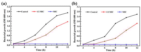 In order to determine the antibacterial activity of the sample, Escherichia coli (Gram-negative bacteria, China General Microbiological Culture Collection Center, Beijing, China) and Staphylococcus aureus (Gram-positive bacteria, China General Microbiological Culture Collection Center, Beijing, China) were selected for antibacterial experiments [26]. (1) Measure the MIC (minimum inhibitory concentration): the fresh LB medium (Luria-Bertani medium) was divided into several glass test tubes, 5 mL per tube, and used after high temperature sterilization. Then, a certain concentration of the test sample was added to the test tube, the concentration increased according to the gradient, and a blank control group was set. Finally, 50 µL of Escherichia coli or Staphylococcus aureus bacterial solution was added into each test tube. Then, the tubes were placed in a shaker at 37 °C for 12–16 h and the growth of the bacteria in the test tube was observed to determine the MIC of the sample. (2) Determination of the bacterial growth curve containing the sample: fresh LB medium was configured and sterilized for later testing; 1/2 MIC and MIC concentration test samples to each group of media. The absorbance was measured at OD600 (the absorbance of the solution at 600 nm wavelength) every 2 h and a growth curve was drawn. (3) Plate experiment: the fresh LB agar medium was configured and poured on the plate after high temperature sterilization. The test samples with concentration of 1/2MIC, 1/4MIC, and MIC were added to the LB medium, respectively. Then, the two bacterial solutions were added and the cells were cultured at 37 °C for 12 h. After absorbing a certain amount of cultured liquid, it was spread on the prepared plate and further placed in a 37 °C incubator for 24 h to observe the growth of the colony. Here, a blank control was set with the same process.