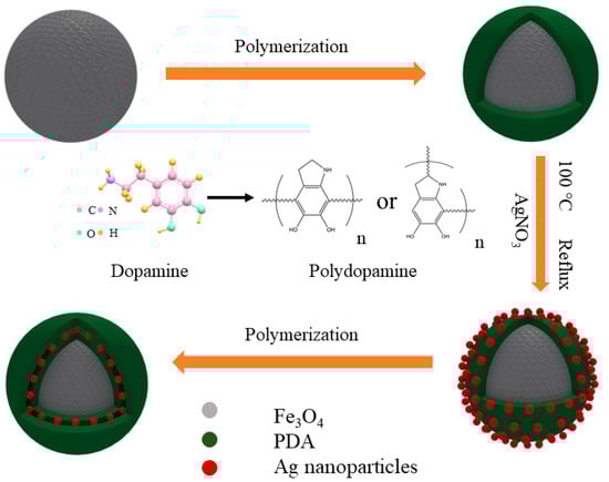 The schematic formation mechanism process of the Fe3O4@PDA/Ag/PDA nanospheres.