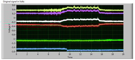 A typical measured signal is shown in Figure 6. There are electric signals from all Wheatstone bridges formed by extensometers placed on deformation elements of the force sensor. One bridge is for the x+ axis (two deformation elements), the next one for x− axis (two deformation elements). Two more bridges are for y+ and y− axes. The force in the selected direction is a mean of the absolute values in both directions of the respective axis. It was a different situation with z axis, because only the direction towards the ground is relevant. There are also two couples of deformation elements with respective bridges, but each of them registers only a part of the total force in the z direction. Therefore, the resulting force is a sum of these parts. The force signal after processing in LabVIEW program is presented in Figure 7.