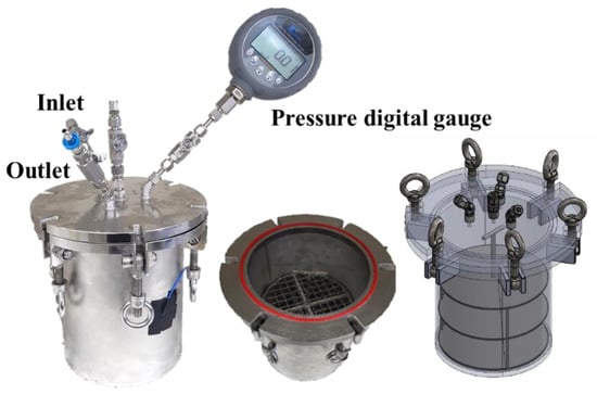 Figure 1 shows a pressure vessel designed to have a single inlet valve and a single outlet valve. The internal temperature and pressure were monitored during the 3 bar CO2 curing. Pressure loss caused by cement carbonation was measured using a pressure digital gauge (PDR1000; Pressure Development of Korea Co., Daejeon, Korea). Its measurement range was from −100 kPa to 400 kPa, and its precision was 0.1%. The sampling rate for the pressure measurement was 1 record per second.