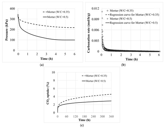 Pressure loss and CO2 uptake of Mortar (W/C = 0.35) and Mortar (W/C = 0.5). (a) Decrease of CO2 pressure, (b) Carbonation rate, (c) CO2 uptake.