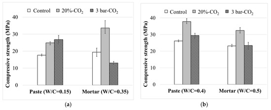 Figure 3 compares the 1-day strengths of the 40-mm cube samples. The CO2 curing was influential in the early-age strength development of the paste samples. The strengths of Paste compact (W/C = 0.15) and Paste sample (W/C = 0.4) subjected to CO2 curing were higher than the control sample (moisture curing for 24 h). The 20% CO2 curing for 24 h was much more effective in the Paste samples (W/C = 0.4), while the 3 bar CO2 curing was better in the Paste compacts (W/C = 0.15). The effectiveness of the CO2 curing condition bifurcated with the mortar samples. The 20% CO2 curing resulted in a higher strength regardless of the casting method, whereas the 3 bar CO2 curing failed.