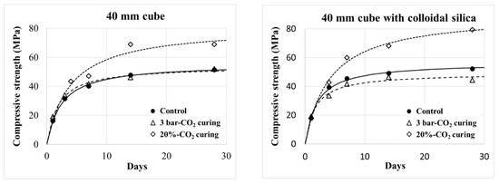 Controlling the pore system, by the use of nano-sized particles, also affects the efficiency of CO2 curing. The nucleation effect of nano-sized limestone powder on CO2 curing was reported [17,18]. In addition to the nano-sized limestone powder, this study further investigates the effect of incorporating colloidal silica. The nano-sized silica particles reportedly nucleate the hydration of cementitious materials in accompany with their pozzolanic reaction [19]. As a result, it reduces the degree of chloride ion penetration [20,21] even though the increase in compressive strength is not substantial [22]. Lastly, the optimization for CO2 curing conditions, together with the effect of specimen size, is also investigated for the purpose of controlling the pore system.