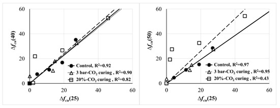 Using Equation (7) allows us to consider the strength development of each sample. For example, Δfcu (25) is calculated by the difference in the 25-mm cube strength at a certain age compared with 28 days (the reference age). Figure 6 comparatively shows the strength variation (development) of Mortar (W/C = 0.5). The linear trend lines, whose slopes correspond with the constant in Equation (6), do not change according to CO2 curing when the 25- and 40-mm cube strengths are compared: Δfcu(25) and Δfcu(40) in the left figure. However, the linear trend lines of the samples subjected to the 20% CO2 curing go off on the trend with the 50-mm cube strength (Δfcu(25) and Δfcu(50) in the right figure). The resultant nonlinear trend indicates that the size-effect parameters in Equation (6) need corrections or its reformulation. Partial carbonation on the edge of the 50-mm cube specimen, as shown in Figure 5, breaks the assumption of a geometrically similar specimen, which results in the nonlinear trend. In order to fit into the size effect law, the degree of carbonation in specimens with different size should be similar under the same CO2 curing condition. However, in this study, as the specimen size is larger, the depth of carbonation is smaller. This result may show that the size effect law of the specimen in CO2 curing does not fit.