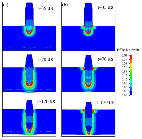 Figure 5 shows the strain distribution of the projectile and plate during the penetration process. At t = 35 µs, the steel core penetrated the target plate, and the brass jacket and lead jacket developed serious plastic deformation and failed quickly when interacting with the target plate. Severe plastic deformation with the effective strain of 0.3 occurred in the titanium alloy near the tip of the steel core in both schemes. For CPTi/Ti64, the plastic deformation of the CP-Ti layer was also considerable. At t = 70 µs, the brass jacket and lead jacket penetrated the target plate, thus enlarging the crater on the front of the target plate of both Ti64/CPTi and CPTi/Ti64, but almost half of the brass and lead had failed due to severe deformation. At t = 120 µs, the projectile had been stopped. The brass jacket and lead jacket were totally ripped off and most of them failed, causing a larger deformation on the target plate. However, the tip of the steel core experienced small plastic deformations during penetration. Although Ti6Al4V produces large plastic deformation in both schemes, the plastic deformation of CP-Ti in Ti64/CPTi is relatively small compared with CPTi/Ti64.