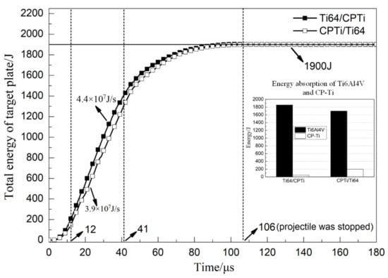 Figure 9 shows the total energy absorption history curve of Ti64/CPTi and CPTi/Ti64. As shown in the figure, the curves in the two schemes exhibited the same trend: A rapid increasing stage (0–12 μs); a linear increasing stage (12–41 μs); and a slow increasing stage (41–106 μs). The energy absorption rate in both schemes was calculated from the slope of the linear stage. The results revealed that the energy absorption rate of Ti64/CPTi (4.4 × 107 J/s) was higher than that of CPTi/Ti64 (3.9 × 107 J/s). This indicated that more energy was absorbed in the early stage (than in the late stage) of the penetration process when the Ti6Al4V was placed on the striking face. Therefore, the fracture induced on the rear face of the laminated armor plate was alleviated. A total energy of 1900 J was absorbed by the target plate in each scheme. However, the differences between the energy absorption rates of Ti64/CPTi and CPTi/Ti64 in the early stage led to significant differences between the energy absorption distributions. As shown in the inset of Figure 9, the Ti6Al4V total energy absorption values of Ti64/CPTi and CPTi/Ti64 (1855 and 1701 J) accounted for 97.6% and 89.5%, respectively, of the total absorbed energy. The Ti6Al4V layer absorbed more energy during Ti64/CPTi penetration (than during CPTi/Ti64 penetration), so more lamellar tearing occurred in Ti6Al4V (as shown in Figure 6a,c). Therefore, the higher strength Ti6Al4V layer absorbed more kinetic energy as the striking face, while the CP-Ti layer maintained the structural integrity as the higher ductility back layer, thereby inhibiting crack propagation on the rear face.