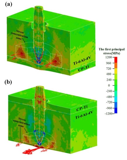 Figure 10 shows the contour of the first principal stress associated with Ti64/CPTi and CPTi/Ti64 composite target plates at 100 µs during the penetration process. The vector of the first principal stress corresponding to several typical elements is indicated in the figure. The head of the arrow represents the direction of the stress, and the color and length represent the magnitude. A high stress concentration region, which was indirectly connected to the penetration channel and radially distributed in space, was generated in both schemes. Moreover, the stress vector showed that the first principal stress in the high stress concentration region was tensile in both schemes. The magnitude of this stress was, for some elements, >1000 MPa, i.e., higher than the tensile strength of Ti6Al4V, and therefore, cracks were preferentially initiated in these regions. In addition, the high stress concentration region of Ti64/CPTi took up more space than in the CPTi/Ti64 plate. Consequently, the lamellar tearing generated in the CPTi/Ti64 plate was less extensive and narrower than that in the Ti64/CPTi plate (as shown in Figure 6a,c). The high stress concentration region was generated on the back of the CPTi/Ti64 target plate, and the first principal stress in this region exceeded 1200 MPa. Therefore, crack formation was induced on the rear face of the target plate (as shown in Figure 6c).