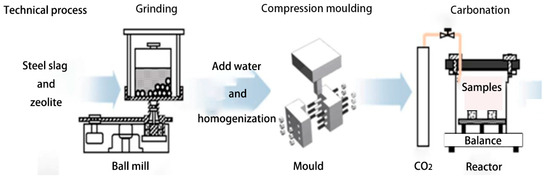 Accelerated carbonation is an innovative method, in which Ca/Mg-silicates minerals react with CO2 and moisture to form calcium or magnesium carbonate in Equation (1) [4]. It can increase the compressive strength of steel slag products dramatically in a few hours by forming calcium carbonate. And Shao et al. [16] proposed the combined-curing process (carbonation 2 h and then hydration 28 days) to enhance the compressive strength of steel slag compacts further. To improve the carbonation degree, many researchers investigated the influence of carbonations by controlling parameters such as CO2 concentration, partial pressure, humidity, compacting pressure, slag fineness, carbonation duration, and temperature. Except for these methods, steel slag partially substituted by zeolite was also beneficial to modify the compressive strength and carbonation degree by the previous study.