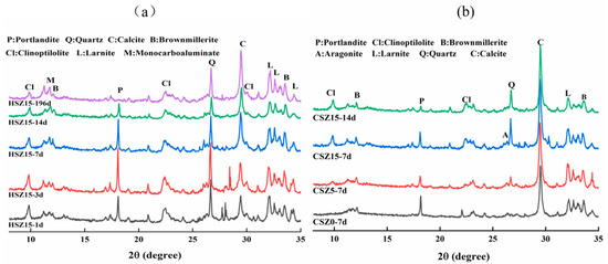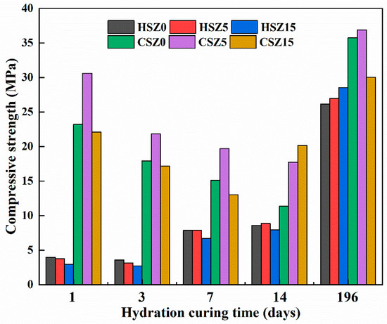 The compressive strength values of HSZ and CSZ specimens were shown in Figure 4. Steel slag with zeolite (SZ) specimens had shown a latent hydraulic behavior. In the first 3 days, the strength of SZ specimens gained slightly. Meanwhile, the sequence of compressive strength values was HSZ0 > HSZ5 > HSZ15. When the hydration time increased to 7 days, all strength value nearly doubled it. And the compressive strength of HSZ5 was equal to that of HSZ0. After 14 days hydration, the strength value of HSZ5 was slightly higher than that of HSZ0. The increment of strength value was beneficial from zeolite with pozzolanic activity. After 196 days hydration, the sequence of compressive values was HSZ15 > HSZ5 > HSZ0. It illustrated that a higher zeolite ratio participated in a pozzolanic reaction to modify the strength in HSZ15 by prolonging the hydration curing time. Obviously, in the first 7 days hydration, steel slag substituted by zeolite partially got the strength loss compared with HSZ0 due to its high porosity. However, after prolonging hydration time to 14 and 196 days, the strength of SZ specimens started to increase due to the pozzolanic reaction of zeolite in an alkaline environment created by steel slag. Meanwhile, the strength value of HSZ5-14d performed higher than HSZ15-14d. However, the sequence of strength value was opposite for HSZ5-196d and HSZ15-196d. It illustrated that excess zeolite participated in the pozzolanic reaction with the prolonging hydration curing time.
