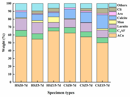 For better understanding the strength development mechanism of SZ samples after hydration and carbonation, The Rietveld method (QXRD) was carried out on the HSZ-7d and CSZ-7d specimens. The results were shown in Figure 6. After 7 days hydration, monocarboaluminate produced in HSZ specimens, especially in HSZ15-7d due to the higher content of zeolite, providing sufficient Al ion for reaction in Equation (10). After 2 h carbonation, the CaCO3 content in CSZ5-7d and CSZ15-7d was 12.1% and 45.3% higher than that of CSZ0-7d, respectively. Meanwhile, monocarboaluminate nearly disappeared in CSZ15-7d, owing to the reaction in Equation (11) [32,33]. Compared with HSZ-7d, the reduction of ACn amount in CSZ15-7d was owing to the C–S–H carbonation in Equation (12). Combined the strength value of CSZ specimens and XRD analysis, it revealed that 5 wt.% substitution of steel slag by zeolite performed optimum strength in CSZ-1d, CSZ-3d, and CSZ-7d. However, the optimum substitution ratio changed from 5 to 15 wt.% in CSZ-14d. Combined with XRD analysis, the weaken intensities of clinoptilolite peaks in HSZ-14d indicated that a higher amount of zeolite participated in the pozzolanic reaction in Equations (6)–(10). The increasing amount of C–S–H gel and monocarboaluminate was beneficial for improving the compressive strength and carbonation degree of CSZ specimens.