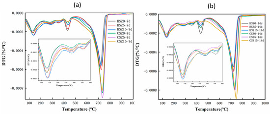 Differential thermogravimetry (DTG) curves of SZ specimens after “H” or “C”. (H: hydration at different times; C: hydration at different times and subsequent 2 h carbonation). (a) DTG curves of HSZ-7d and CSZ-7d; (b) DTG curves of HSZ-14d and CSZ-14d.