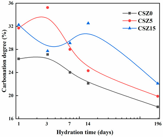 Carbonation degree of CSZ0, CSZ5, and CSZ15 specimens after different hydration time and then 2 h carbonation.