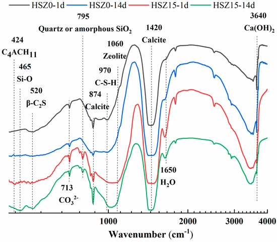 FT-IR spectra were useful in acquiring information about the pozzolanic reaction and hydration products such as C–S–H. Figure 9 represented the FT-IR spectra of HSZ0 and HSZ15 after 1 day and 14 days hydration. In steel slag matrix, the CaCO3 minerals are expected to present a strong C–O vibration band in 731 cm−1 (calcite or aragonite) [35], 874 cm−1 (calcite) [36,37], and around 1420 cm−1 (calcite) [37,38]. And the Si–O asymmetric stretching vibration band around 520 and 975 cm−1 were related to β-C2S [37] and C–S–H [35]. And a weak stretching vibration band at 795 cm−1 could be assigned to quartz or amorphous SiO2 [39]. The O–H bending vibrations in the region 1600–3700 cm−1 were assigned to the presence of absorbing and crystal water, including OH– in Ca(OH)2 at 3640 cm−1 [38]. And zeolite phases present a strong Si–O strength vibration around 1060 cm−1 [39] and the in-plane (460 cm−1) Si–O bending vibrations changes as results of polymerization of SiO44– unit in steel slag [29] and Si-gel [35]. Meanwhile, the bending vibrations in 424 cm−1 (AFmc) [30] was also detected.