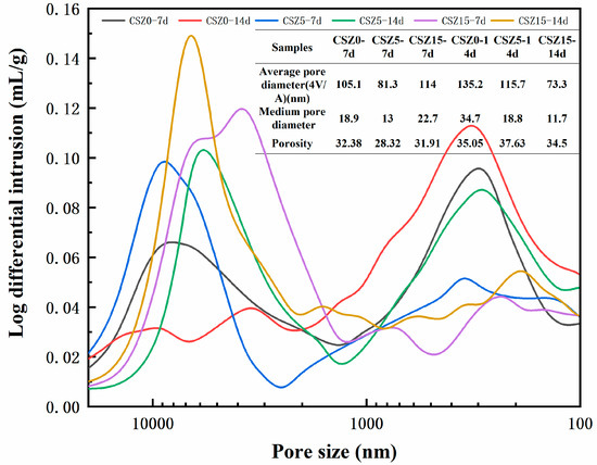 To study the effects of different hydration curing periods on the pore size distribution of CSZ specimens, a mercury intrusion porosimeter (MIP, AUTOPORE IV 9500 series, Micromeritics Instrument Corp, Downers Grove, IL, USA) method was performed. The tested specimens were broken into 3–5 mm pieces and the total weight was approximately 1.5 g. The pieces were dried in a vacuum chamber at 50 °C for 24 h to remove absorbed water in pores.