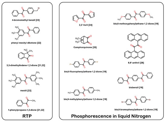 α-dicarbonyl molecules such as benzil and benzil derivatives reported to emit room-temperature phosphorescence (RTP) or phosphorescence at 77 K.