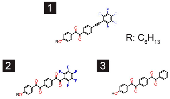 Very recently, we reported the synthesis of new derivatives based on the benzil framework (Figure 2), as well as their steady-state photophysical properties [31]. Fluorinated monobenzil 1 and fluorinated (or non-substituted) bisbenzil 2 (and 3), which are synthesized by a facile PdCl2/dimethyl sulfoxide (DMSO) oxidation protocol from common bistolane derivatives, are capable of emitting RTP. The photoluminescence quantum yields (PLQYs), recorded for the derivatives in toluene solutions, are approximately 2% for 1 and <1% for 2 and 3. The absorption peaks at approximately 400 nm, which is the maximum absorption wavelength of the derivatives, are attributed to an n-π* transition based on theoretical calculations. We suspected that the fluorination of one side of the aromatic ring of the benzil derivatives may retard the ISC, leading to weaker RTP. In this study, we studied the excited-state dynamics of benzil derivatives using time-resolved PL spectroscopy to understand their photophysical properties. In addition, we investigated the photostability of 1–3 using an Xe discharge lamp. The fundamental question is how do the side groups of the benzil derivatives affect the conformational flexibility and emission of RTP by comparison with benzil? In addition, we aimed to uncover the role of the monobenzil and bisbenzil structures, as well as the effect of the fluorination of the side group, on the low PLQY of these compounds.