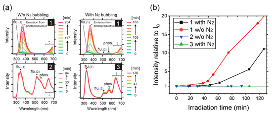 First, we discuss the photostability of 1−3 in toluene based on steady-state measurements. Figure 3a shows the irradiation-time-dependent PL spectra of 1−3 in toluene obtained using a 290 nm Xe-discharge lamp. Here, 1 was measured with and without (w/o) N2 bubbling to investigate the photostability of both excited singlet and triplet states of the compound, respectively. For 2 and 3, N2 bubbling was performed only for 3 because both 2 and 3 showed similar PL patterns despite the presence of a fluorinated phenyl ring in 2. The initial spectra of 1 (t = 0 min, fresh sample) are shown in Figure S1 (see Supplemental file). The first fluorescence band (flu.(1)) peaked at 340−360 nm, the second fluorescence band (flu.(2)) peaked at approximately 520 nm, and the phosphorescence band (phos.) peaked at around 560 nm, as previously reported [31], and could be ascribed to an emission from S2 for flu.(1), S1 for flu.(2), and T1 for phos. bands. These bands were typical of the benzil moiety [30,32], but not tolane [33,34,35,36,37]. An emission from higher excited states implied anti-Kasha behavior, and many molecules were known to exhibit the emission [13,38,39]. It is worth noting that we confirmed that the flu.(2) band was not a thermally activated delayed fluorescence band for 2, as has been reported for benzil in imidazolium ionic liquids [29] (see Figure S2). Additionally, no excitation wavelength dependence was seen for the flu. (2) band (Figure S3). The absorption spectra of the fresh (irradiation time (t) = 0 min) and the final sample of 1 solution are shown in Figure S4, where the initial absorbance of the maximum absorption band at approximately 313 nm decreased by 15% after the final PL measurement. While the wavelength of the excitation light (290 nm) for the PL measurements was far from the absorption maximum wavelength at approximately 400 nm, it was chosen to excite the molecules to higher excited singlet states, enabling the detection of both flu.(1) and flu.(2) bands.