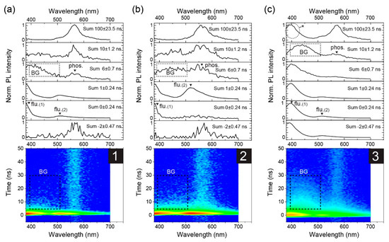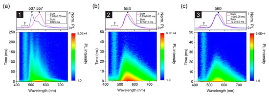 Time-resolved PL spectra of (a) 1, (b) 2, and (c) 3 at 77 K measured using the multichannel scaler (MCS) method: (top) Intensity summed PL spectra taken at time regions depicted in each graph legend, (bottom) contour map of the time-resolved results. The excitation light source was a pulsed LED at 355 nm. The region marked with a hash (#) is a background feature attributed to scattering by the sample cell containing solvent.