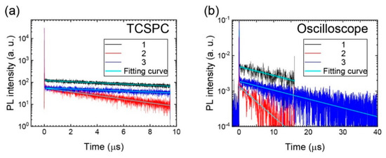 The observation of a longer T2 lifetime compared to that of T1 at 77 K (Figure 4a) implies anti-Kasha behavior in 1 [38,39,40]. This suggests that 1 shows different RTP behavior to 2 and 3. However, as we characterized the RTP time profiles under nearly identical absorbance conditions for the excitation light (see below), the existence of T2 in 1 was revealed to affect the ISC efficiency, but not the RTP lifetime. Figure 5a,b show the transient PL results of the RTP band measured by TCSPC and a 12-bit oscilloscope, respectively. The former was conducted first and the latter was performed to confirm the TCSPC data because our TCSPC systems had difficulty measuring the measurement time region with sufficient time resolution for 1 and 3. A single decay exponential function was successfully used for curve fitting of the time profiles of RTP of both the measurement systems; τ of RTP (τRTP) was estimated to be 16.9 µs (by TCSPC)/17.5 µs (by oscilloscope) for 1, 5.2 µs/5.2 µs for 2, and 18.8 µs/17.5 µs for 3. Compounds 1 and 3 exhibited relatively large and very similar τRTP values compared to 2. As 2 and 3 only differed by the substituted F atoms on the phenyl side group, we inferred that fluorination might decrease the RTP lifetime. The amplitude of 1 was stronger than 3 by a factor of 3.6, but the lifetimes were very similar. This implies a faster ISC in 1 than 3, plausibly because T2 is very close to S1. The small difference in the amplitude between 2 and 3, which differ by a factor of 1.4, suggests a similar ISC process for the two derivatives, but the T1 lifetime was longer for 3 than 2, which results in a more intense RTP emission in non-fluorinated 3.