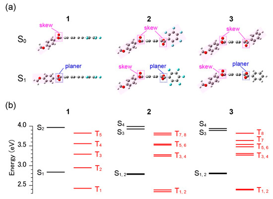 To verify the above hypotheses, we conducted theoretical calculations of 1–3 using DFT and TD-DFT. Figure 7a shows the molecular geometries of 1–3 optimised for S0 and S1 states. All the derivatives exhibit a skew geometry of the benzil moieties in S0. Owing to the skewed geometry, the side phenyl groups are significantly bent away from the plane of the central phenyl rings (see the pink square in Figure 7a). In the S1 geometry, however, the conformation of the dicarbonyl group is more planar in 1 and the side phenyl ring is close to the plane of the central phenyl ring. For 2 and 3, the geometries of the S1 states are the same as for 1, and only the dicarbonyl group connected to the other side of the phenyl with no alkoxy group becomes planar—the geometry of other dicarbonyl groups with alkoxy phenyl rings remain unchanged. A close inspection of 2 reveals that the planarity of the side perfluorinated phenyl ring relative to the central phenyl ring is lower than that of the non-substituted phenyl ring of 3. This is an effect of the greater steric bulk of 2 compared to 3.