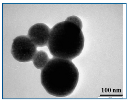 The MPs were investigated using Transmission Electron Microscopy (TEM), with a JEOL JEM-1010 system (JOEL Ltd., Tokyo, Japan). TEM investigations showed that the MPs have spherical shapes and sizes in the range of 50 to 200 nm—Figure 1. Their core consists of highly packed MPs with a ~8 nm diameter obtained as described above. The thickness of their SiO2 shell was evaluated at approximately 20 nm.