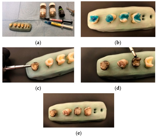 For Groups 2 to 4, the adhesive was mixed with the MPs used in the study, as presented in Section 2.1. For the five samples of Group 2, the dental adhesive loaded with MPs has been applied conventionally. For each of the five samples (loaded with MPs) of Groups 3 and 4 a magnetic field was applied for 5 and 10 min, respectively, using a permanent magnet applicator, as shown in Figure 2c,d. After the application of the MPs-loaded adhesive, the cavities were filled with a fluid composite material, as shown in Figure 2e.