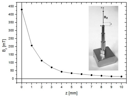 One must highlight that in the second step of this procedure, the permanent magnet applicator must be kept as close as possible to the adhesive doped with MPs, as the magnetic field induction as a function of the distance z from the applicator tip drops significantly, as presented in Figure 3.