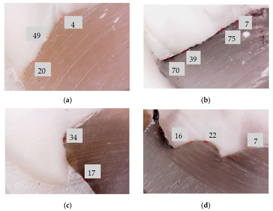 Example of a microscopy analysis of the width/thickness of the dental adhesive layer on a sample: (a) without MPs (from Group 1); (b) with MPs (from Group 2); (c) with MPs applied in a magnetic field for 5 min (from Group 3) and (d) for 10 min (from Group 4). The measured adhesive layer widths are provided in μm.
