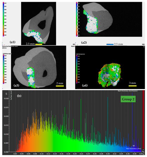(a) Micro-CT investigation on the vestibular (a1), oral (a2), and pulpal (a3) interfaces of a Group 4 sample, with (a4) a 3D reconstruction of the dental layer; (b) area S of the surface of the dental adhesive layer as a function of the width/thickness w—for a Group 4 sample.