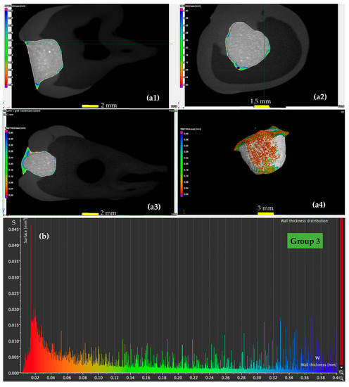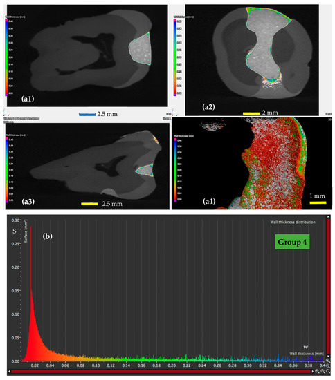 The results of the micro-CT analysis, considering all the results obtained for all samples of each group are presented in Table 4, Table 5 and Table 6. A comparative look between the different groups has been considered to allow for the discussion of the results performed in Section 4.