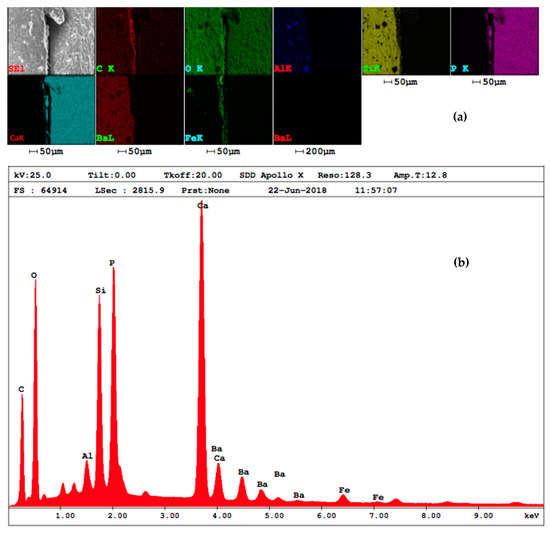 Considering that the adhesive utilized in this study has almost the same refraction index as air, the interface between the tooth structure and the filling material could include both adhesive and air inclusions. For this reason, a SEM with EDAX has been done on the interface to evaluate the adhesive layering. Thus, Figure 9a demonstrates the presence of MPs, while the diagram of the chemical components of the interface in Figure 9b corresponds to the adhesive material doped with MPs; therefore, the presence of air inclusions has been ruled out.
