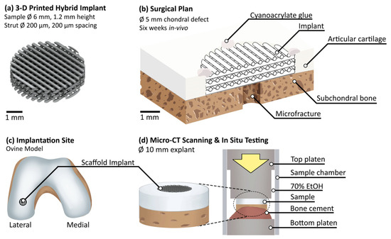 Schematics for each component of this ovine model study: (a) hybrid 3D printed scaffold implant design; (b) cross-section through surgical procedure plan, with the implant sitting within a chondral defect on top of the subchondral bone, with microfracture providing nutrient delivery and secured with cyanoacrylate glue at four points around the perimeter; (c) implantation site in the lateral condyle in a mature female sheep; (d) the extracted sample composed of the integrated hybrid implant–cartilage–bone system underwent in situ compression testing during micro-CT scanning.