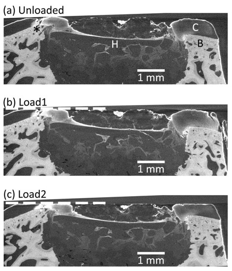Compressive load was successfully applied between successive scans by way of the in situ mechanical testing rig during micro-CT scanning. Analysis of micro-CT established that the subchondral bone had been penetrated during surgery, so that the implant sat under the chondral surface in a void surrounded by subchondral bone (Figure 3a). The topography of the bone created an uneven bone-cartilage interface height, which impeded compression of the cartilage (Figure 3a *). The placement of the implant, at the level of the subchondral bone, did not permit comparable compression of the implant-cartilage interface (Figure 3b,c).