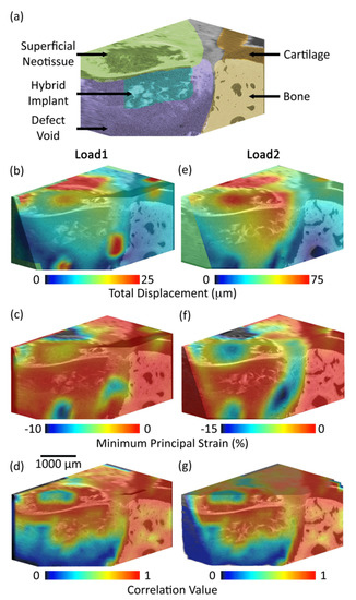 Displacement and strain were successfully calculated and visualised in three-dimensions (Figure 4). Displacement of the implant compared to the surrounding tissue was observed, giving a measure of relative micromotion (Figure 4b and e). Strain within the implant was low, of a similar magnitude to the surrounding tissue, yet high strain was measured in the defect void at both loading levels (Figure 4c,f). Of note, the correlation value was high (>0.8) for the bone, cartilage and hybrid components, yet the defect void surrounding the implant lacked sufficient pattern, hence only limited correlation was possible in these regions and thus caution must be observed in the mechanical results for these regions (Figure 4d,g).