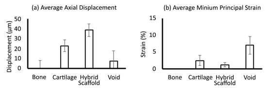Each slice from the three-dimensional volume provided rich localised data points of the displacement from which components of strain may be extracted as required. Total displacement and minimum principal strain were plotted (Figure 5) between the key components of the system. As observed visually, displacement was highest in the hybrid implant, with an average of 40 µm relative to the surrounding bone (Figure 5a). However, when considering strain, the hybrid implant experienced little mechanical strain compared to both the cartilage and underlying void (Figure 5b).