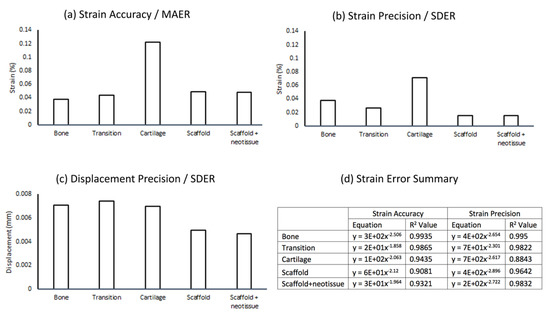 Quantification of error for five components of the tissue-biomaterial system for the evaluated sample (n = 1) at a subvolume size of 80 voxels (360 µm) using the FFT + DC method: (a) Strain accuracy (b) Strain precision (c) Displacement precision (d) Power law relationships computed for the FFT + DC method across all tested subvolume sizes for the system components where y represents the error metric and x represents the subvolume size.