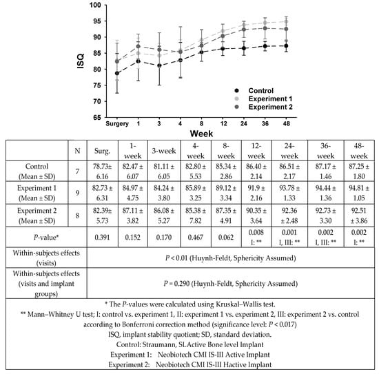 | Data | Variables | Control (Straumann, SLActive Bone Level Implant) | Experiment 1 (Neobiotech CMI IS-III Active Implant) | Experiment 2 (Neobiotech CMI IS-III HActive Implant) | P-Value |