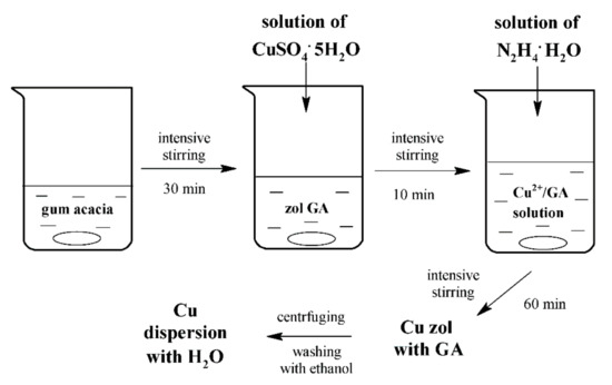 The synthesis of copper nanoparticles was performed in aqueous solution in air at room temperature. At first, 4 g of gum acacia was dissolved in 120 mL of distilled water. The dissolution process lasted nearly 30 min with vigorous stirring of the solution in a 600 mL beaker using a heated magnetic stirrer. Gum acacia was used as a protective medium to prevent copper nanoparticles from sticking and oxidizing after the addition of a reducing agent. A solution of 2.5 g (0.01 mol) of CuSO4·5H2O in 80 mL of water was prepared in another beaker. Then, a solution of copper salt was added to the cooled solution of gum acacia and stirred continuously and vigorously for 10 min. Then, 3.6 mL of N2H4·H2O was added dropwise to the resulting solution. This volume of reducing agent corresponded to a molar ratio to the used salt of 1:10 [24]. The mixture was stirred for 1 h after the addition of hydrazine hydrate.