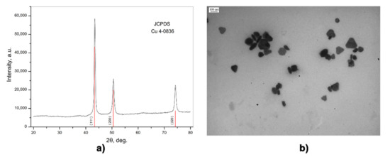 The calculated parameters of the unit cell of the synthesized copper corresponded to a = 3.6114 Å, and a volume of Vunit(Cu) = 47.101 Å3. Analysis of the TEM images showed that the synthesized copper nanocrystals had different shapes with the sizes of individual crystals in the range of 10–100 nm (Figure 2b).