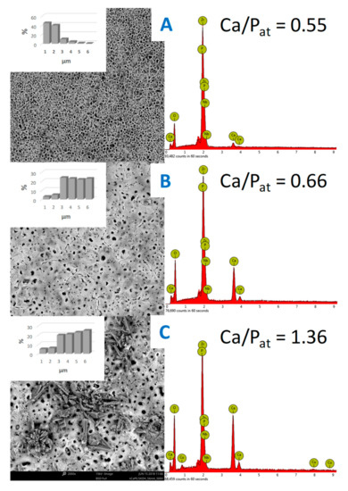 After plasma electrolytic oxidation, the surface of ZrNb acquired a polymorphic character. Longitudinal tubercles with irregular shapes were observed, whose transverse dimensions varied from 5.2 ± 0.7 to 10.4 ± 1.2 micrometers. These structures rose above the overall surface and were accommodated chaotically throughout the area of the samples. In this case, the entire surface of the modified alloy was pierced by cracks (Figure 3) of different lengths and irregular shapes. It is important to point out the appearance of oval pores (craters) of different sizes. Therefore, when using a mode with an electric voltage of 300 V, the internal pore sizes ranged from 1 to 2 microns, with a small number of pores from 3 to 6 micrometers. An increase in voltage up to 450 or 500 V led to the expansion of the craters. The internal dimensions varied from 2.1 ± 0.4 to 6.3 ± 0.8 μm. It should also be noted that when using a mode with a voltage of 500 V, probable phosphate deposits appeared on the surface of the samples (Figure 3C). The transverse dimensions of individual elements were 2–10 micrometers. It is commonly known that the presence of phosphates in the human body affects a wide range of processes. Among them, a bone mineralization process is worth paying attention to. During mineralization, a proper bone tissue structure is being formed. The level of inorganic phosphates strongly influences osteoblast activity and accomplishment of bone mineralization [26]. Thus, the modification of the surface of ZrNb alloys by PEO in a combined solution of copper nanoparticles leads to the formation of mesoporous structures, which should promote cell adhesion on the surface of the samples.