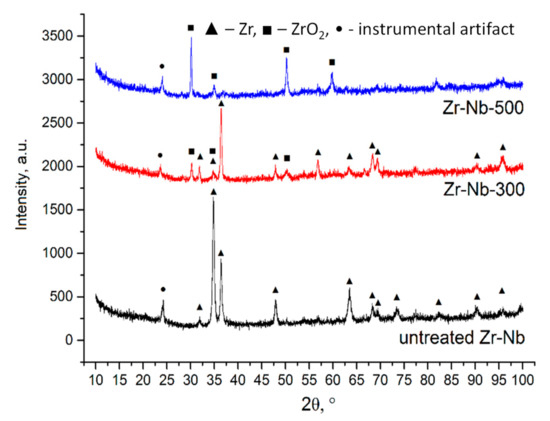 In Figure 4, the X-ray diffraction patterns of the ZrNb alloy processed with PEO in the electrolyte containing Ca, P, KOH, and Cu nanoparticles are shown. The XRD pattern of the unprocessed alloy is below. The peaks marked with triangles ▲ corresponded to Zr (JCPDS card 5-665). The Nb admixture did not change peak positions in the pattern. The relative intensity of the reflections differed from those of the JCPDS card. In the XRD pattern of the PEO-treated samples at 300 V, a phase of zirconium oxide emerged (ZrO2, JCPDS card 49-1642, peaks marked with squares ■). Remarkably, the diffraction pattern of the Zr in this case fully matched the card reference, which may indicate not only the formation of the oxide on the surface, but also the rearrangement the metallic layers. In the pattern of the sample treated at 500 V, only the peaks corresponding to zirconium oxide were visible, which indicates the formation of a thick oxide layer on the surface with a crystal structure of ZrO2. It should be noted that no crystal phases containing copper were found. The peak marked with • cannot be ascribed to any crystal phase and is most likely an instrumental artifact.