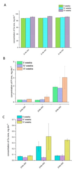 Concentration of the selected ions ((A)—Ca; (B)—P; (C)—Cu) released from the coatings after immersion in Ringer solutions for up to six weeks. Concentration of Zr and Nb ions for all samples after each measurement was below 0.01 mg/L (including the reference sample).